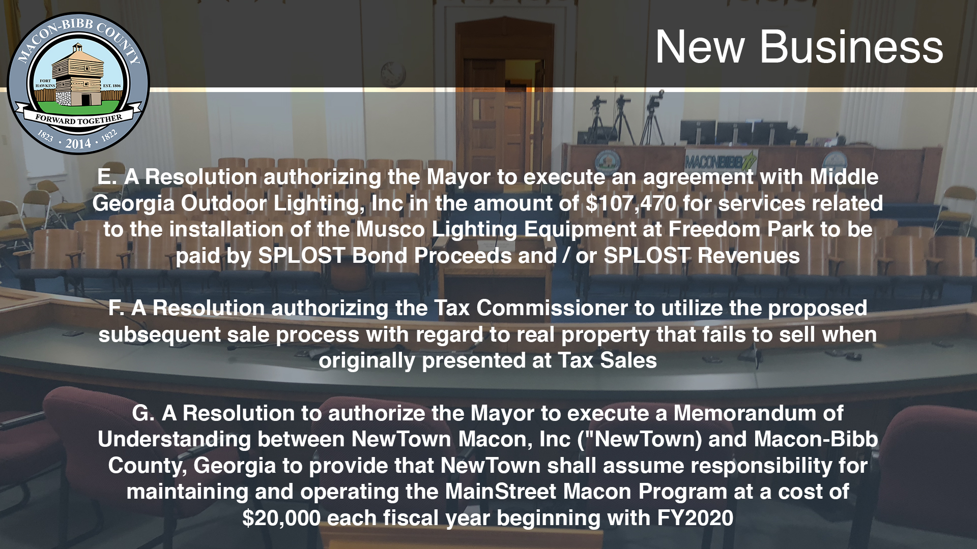 The board approved an agreement with Schneider Electric Buildings Americas, Inc. to conduct a comprehensive, investment-grade audit of energy and resource consumption in Macon-Bibb owned buildings and within street light systems.