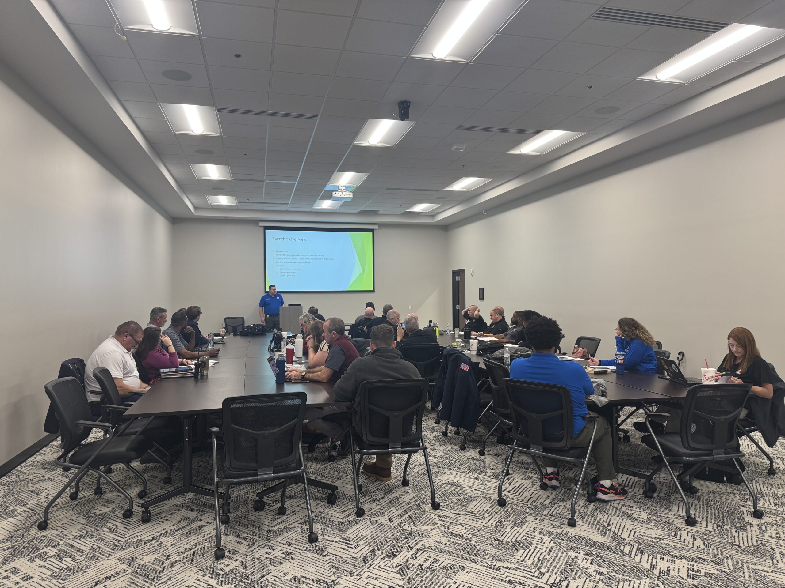 Partners walked through their roles in preparing for a disaster and how operations would be set up in an emergency. They then broke into groups for a simulation focused on the hours immediately following severe weather, covering response actions, public communications, and documentation procedures. Emphasis was placed on accurately tracking hours and expenses, a critical step in securing state and federal funding.