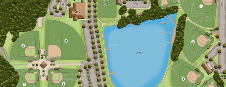 The improvements are being funded with $2.6 million from the voter-approved Special Purpose Local Option Sales Tax (SPLOST), and construction is expected to take 270 days. This phase of improvements includes: four new baseball and softball fields in a wagon wheel configuration, new concession stand at the center of the fields, a new splash pad, removal of the pool that has been inoperable for several years, and relocation of Morgan Drive so that it doesn’t go through the middle of the fields. A rendering of the master plan for Freedom Park is above; this phase is for improvements to the left of Roff Avenue.