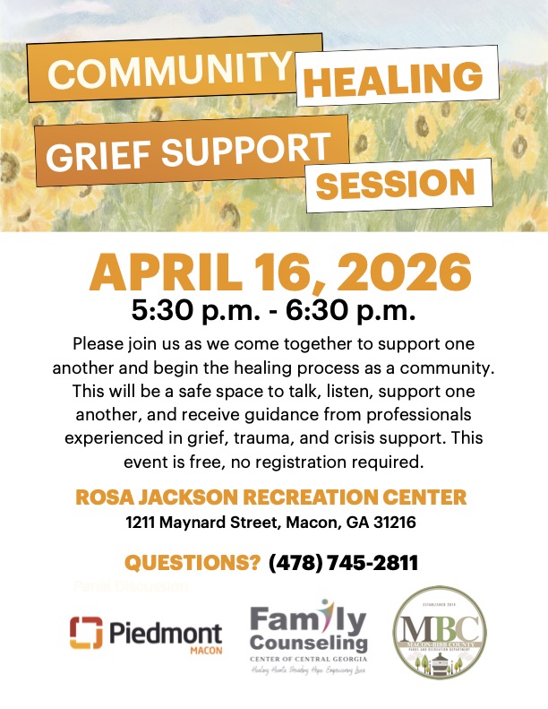 On Thursday, April 16, Family Counseling Center of Central Georgia (FCC) and Piedmont Macon will hold a Support and Grief Support Session at Rosa Jackson Recreation Center (1211 Maynard Street). The session will be held from 5:30 until 6:30 p.m.