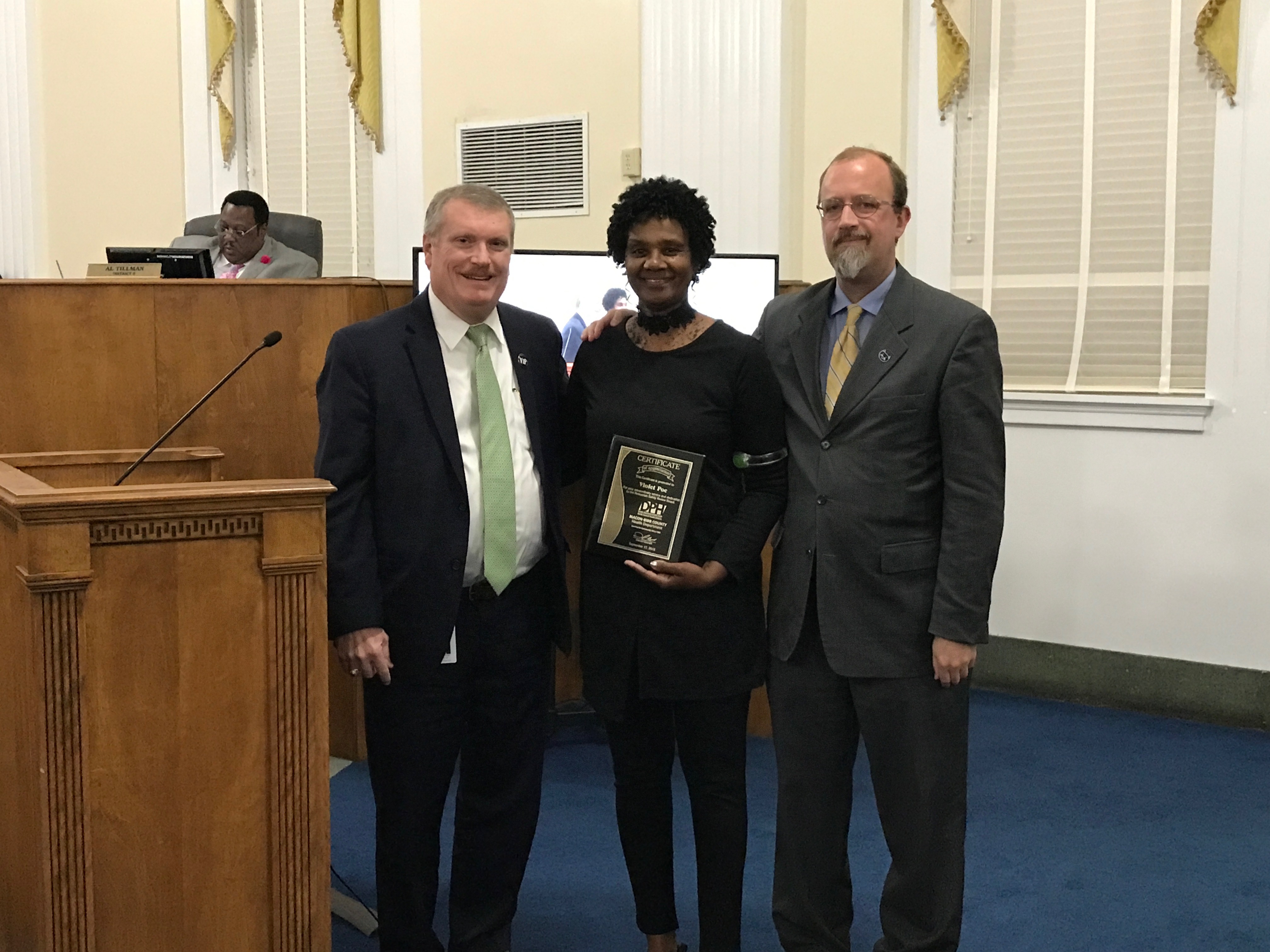 David Gowan, Director of Risk Management for the Bibb County School System, presented an award to Violet Poe for her work on the Pedestrian Safety Review Board. Visit the PSRB website here to learn more about their mission and how they’re working to keep drivers, cyclists, and pedestrians safe in our community.