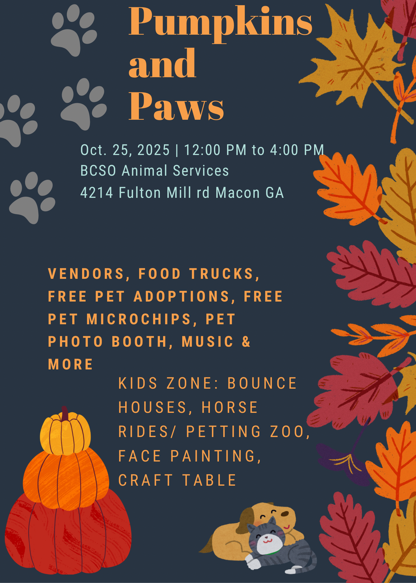The Bibb County Animal Services Division will host its second annual Pumpkin and Paws Fall Festival at the Bibb County Animal Shelter (4214 Fulton Mill Road) on Saturday, October 25, 2025, from 12:00 – 4:00 p.m.