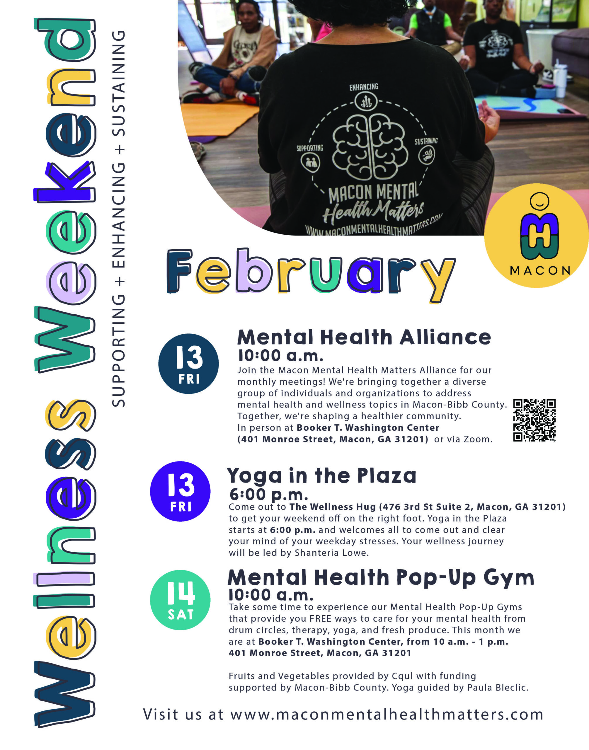 The Wellness Weekend wraps up on Saturday, February 14, with a Mental Health Pop-Up Gym from 10:00 a.m. to 1:00 p.m. at the Booker T. Washington Center (401 Monroe Street). The Pop-Up Gym provides free opportunities to care for mental health through activities such as yoga, drum circles, therapy resources, and access to fresh produce. Fruits and vegetables are provided by C-QUL with funding support from Macon-Bibb County, and yoga instruction will be guided by Paula Bleclic.