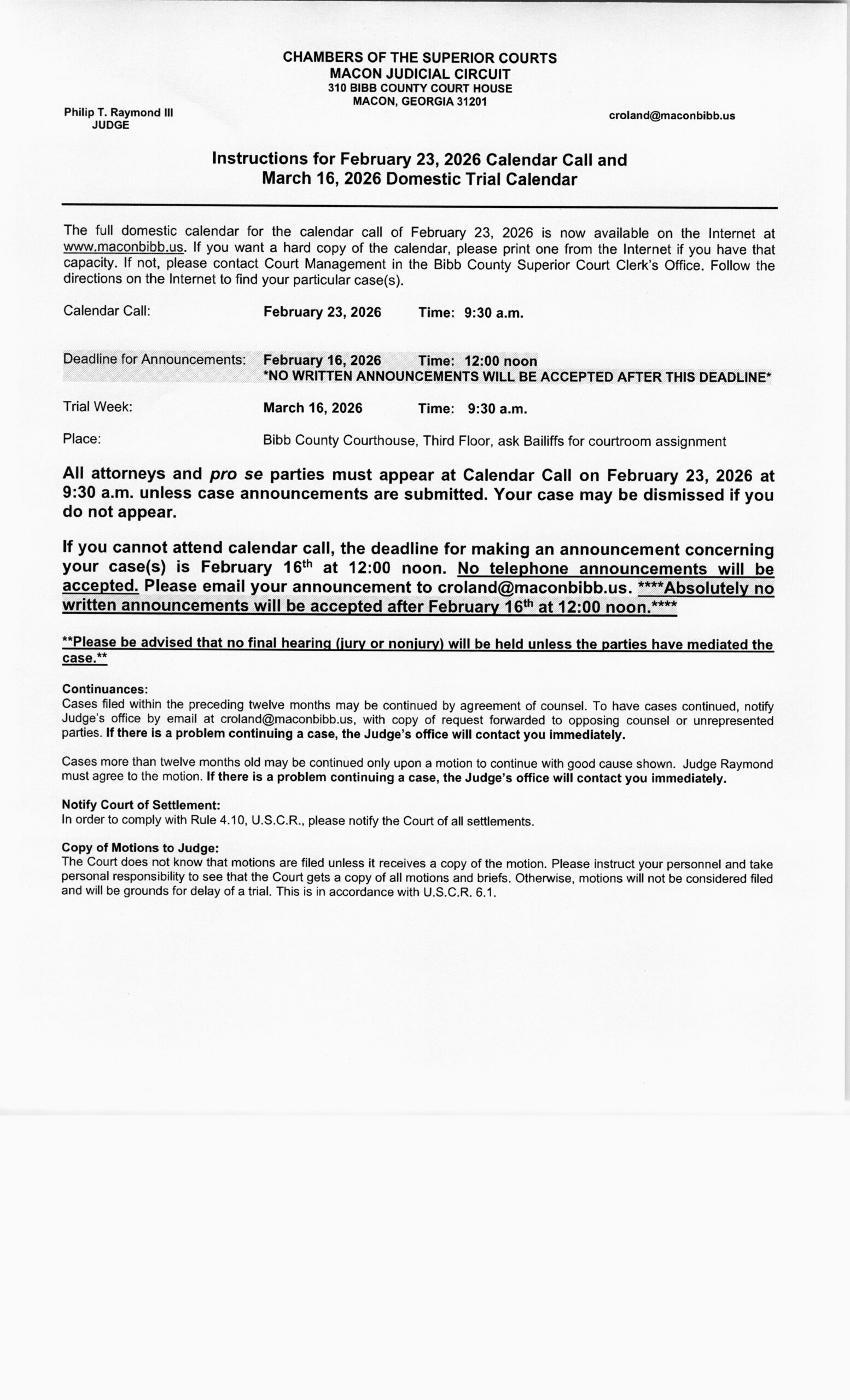 Instruction Sheet And Calendar Call – February 23, 2026