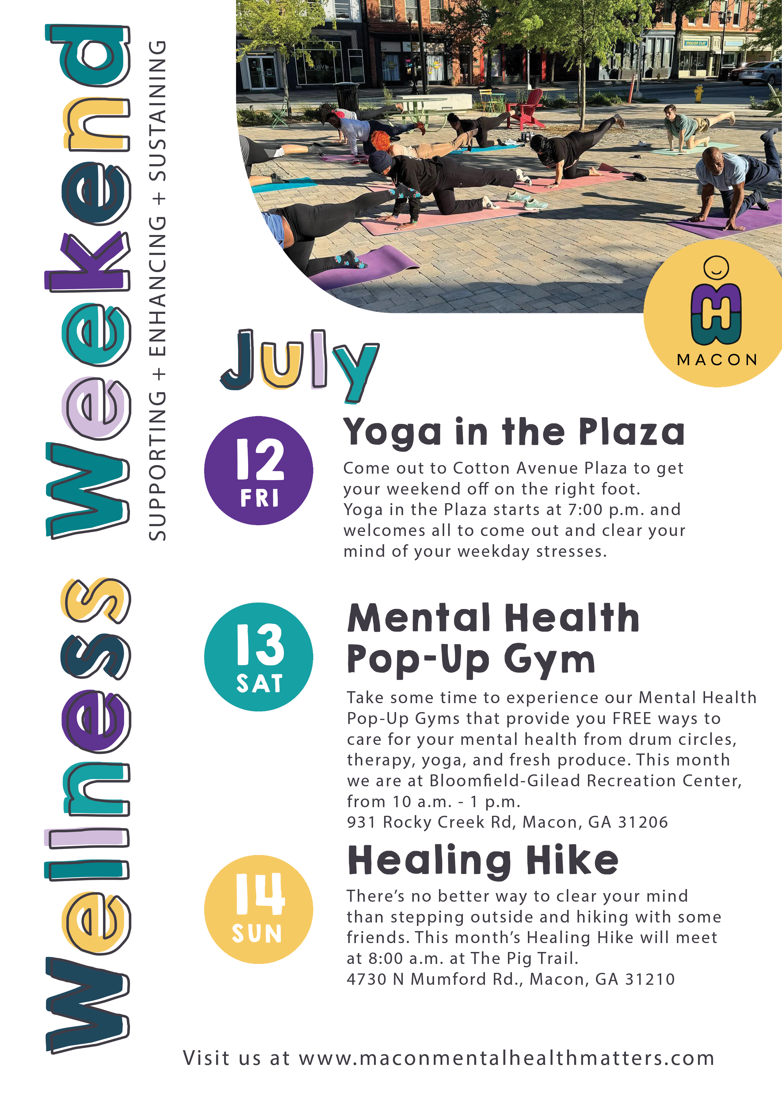 The Macon Mental Health Matters (MMHM) team will host its monthly Wellness Weekend beginning July 11, at 7:00 p.m. The four-day event is a chance for people to focus on improving their mental health through a variety of activities. All events during the weekend are free and open to everyone in the family.